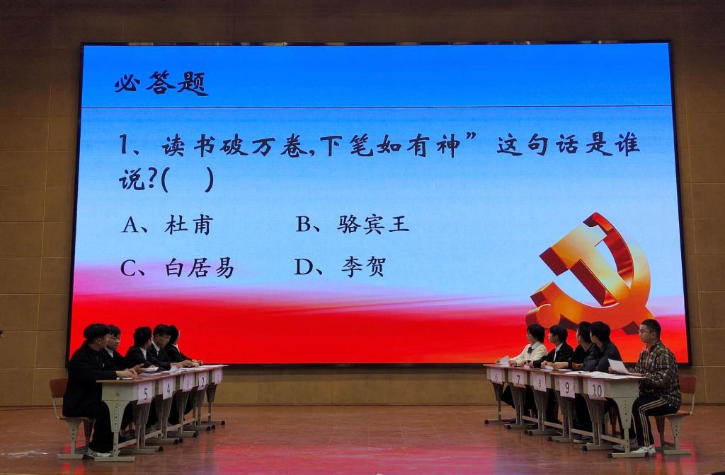 梁军萍做开场致辞,由荣耀舞社团表演开场舞。百科知识竞赛是由suncitygroup太阳新城团总支学生会主办、学习部承办,近一个月的时间准备,参赛人员达150余人,本次竞赛有初赛、复赛、决赛三个阶段。经过前两轮激烈的比拼,共有10名选手脱颖而出进入决赛现场。决赛分为百科知识答题和知识演讲两个环节,有选择题、判断题、抢答题、识图题、音乐题、视频题六个题型,题型多样,现场气氛活跃,观众热情高涨。
