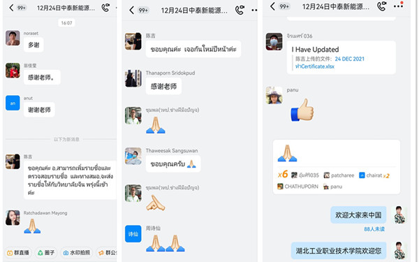 两位授课教师丰富的专业积累、生动的示范讲解和干练的授课风采给泰国参训教师留下了深刻的印象,引发了课后学习交流群的热烈讨论,激发了他们投身新能源汽车技术专业建设的愿望和到中国、到湖北工业职业技术学院继续交流学习的热情。