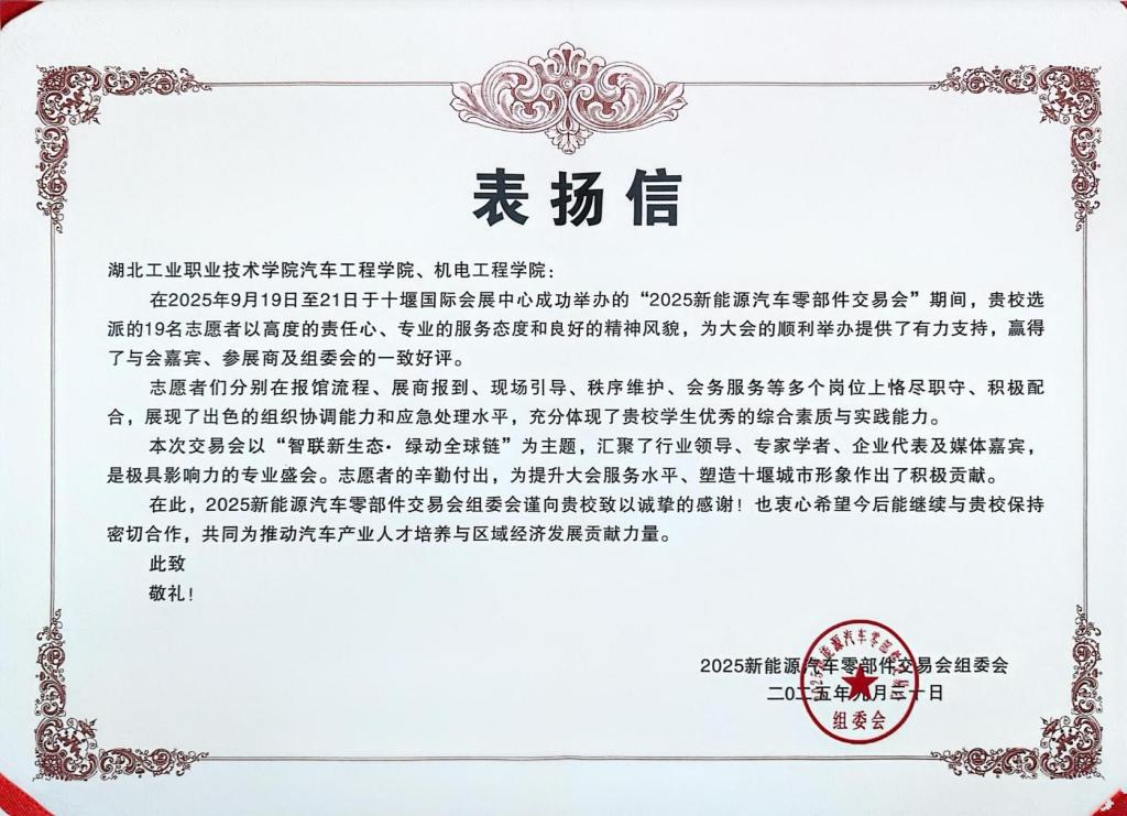 (通讯员李路)近日,suncitygroup太阳新城suncitygroup太阳新城与机电工程学院收到来自“2025新能源汽车零部件交易会”组委会的表扬信,信中对两学院选派的19名志愿者在全程服务中的卓越表现予以高度肯定。