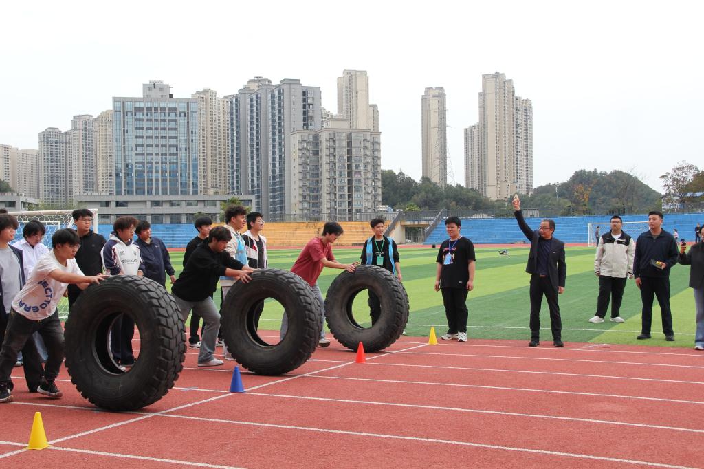 本次趣味运动会共设7个特色竞技项目。男生以班级为单位组队,参与“轮胎接力竞速”、“齐心协力”、“车轮滚滚” 和 “拔河” 四大团体项目;女生则聚焦个人能力展现,角逐 “摸石渡河”、“毽子飞扬”、“跳绳挑战赛” 三个个人项目。尽管深秋的风带着几分凉意,但赛场各处始终洋溢着火热的氛围。无论是团体项目里队员们的默契配合,还是个人项目中选手们的全力争先,整个赛场满是青春的朝气与拼搏的劲头。