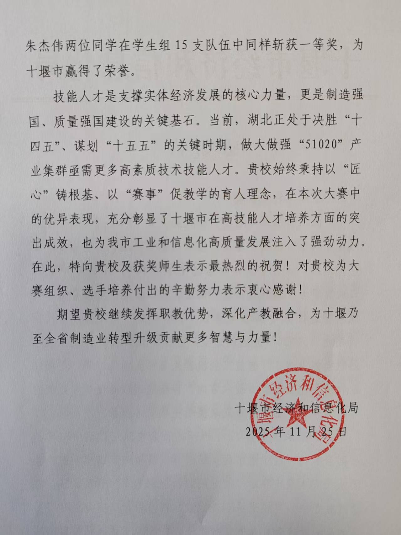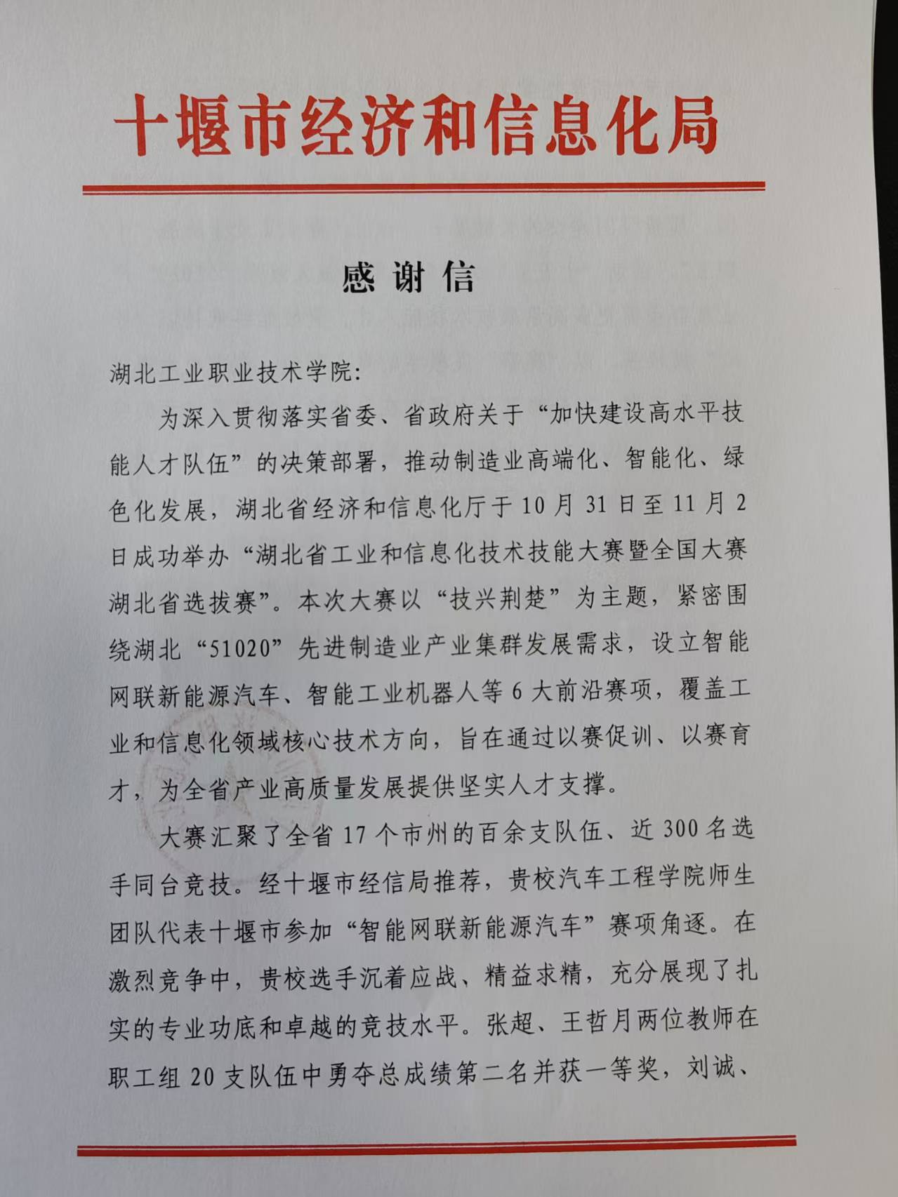 感谢信中指出,本次大赛以“技兴荆楚”为主题,紧密围绕湖北“51020”先进制造业产业集群发展需求,设立智能网联新能源汽车、智能工业机器人等6大前沿赛项。经十堰市经信局推荐,suncitygroup太阳新城suncitygroup太阳新城师生团队代表十堰市参加“智能网联新能源汽车”赛项角逐。张超、王哲月两位教师在职工组20支队伍中勇夺总成绩第二名并获一等奖,刘诚、朱杰伟两位同学在学生组15支队伍中同样斩获一等奖,充分展现了suncitygroup太阳新城师生扎实的专业功底和卓越的竞技水平,为十堰市赢得了荣誉。