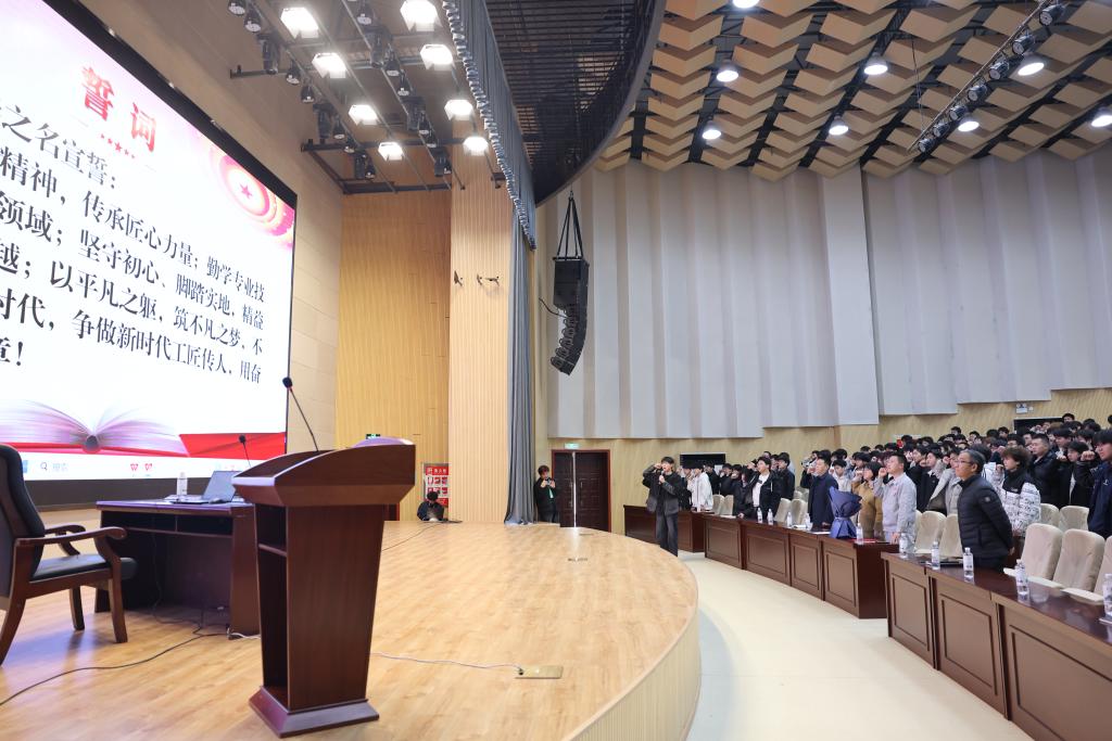 互动交流环节,同学们围绕专业学习、技能提升、职业规划、技术创新等方面踊跃提问,石校坤结合自身经验逐一耐心解答,现场氛围热烈。随后,学生代表向石校坤献花,表示崇高敬意。活动最后,全体学生举起右拳庄严宣誓,立志铭记劳模精神、传承匠心力量,勤学技能、实干笃行,争做新时代工匠传人。
